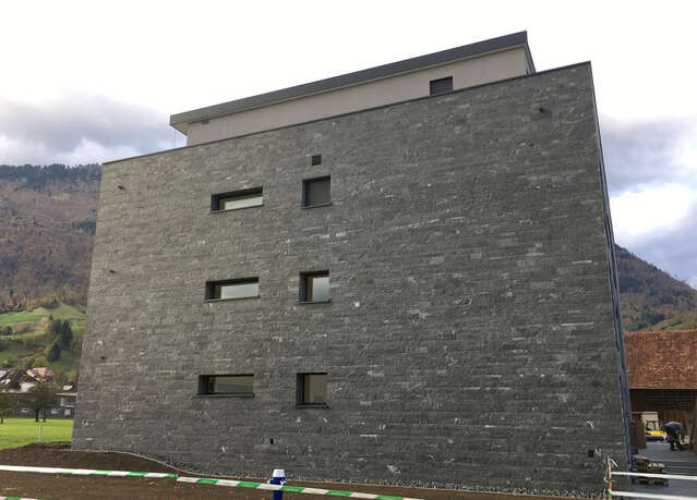 Stoneface eignet sich als optimaler Wärmeschutz für Alt- und Neubauten und benötigt keine mechanische Befestigung der Natursteinbekleidung über 2,5 m Höhe. Es ist erdbebensicher und äusserst witterungsbeständig. Hier wurde der Sockelbereich im stoneface eingekleidet.